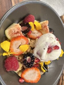 Our spaces are designed to welcome guests year-round—whether you’re relaxing indoors by the wood fire in winter, enjoying the cool comfort of air conditioning in summer, or sitting outside beneath the pergola, taking in the peaceful vineyard views. The pergola is fitted with heating and weatherproof blinds for comfort in every season. Guests can also unwind at our picnic tables set on the grassed area beside the kitchen garden, surrounded by fresh produce and tranquil rural charm