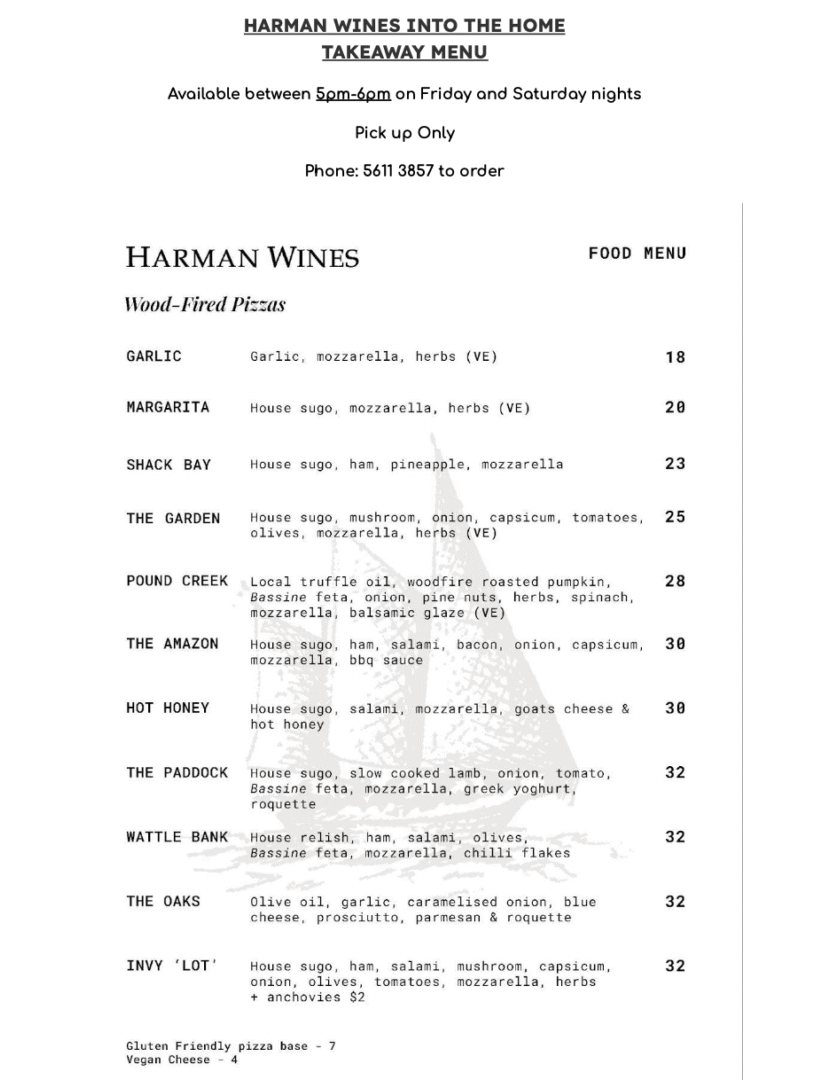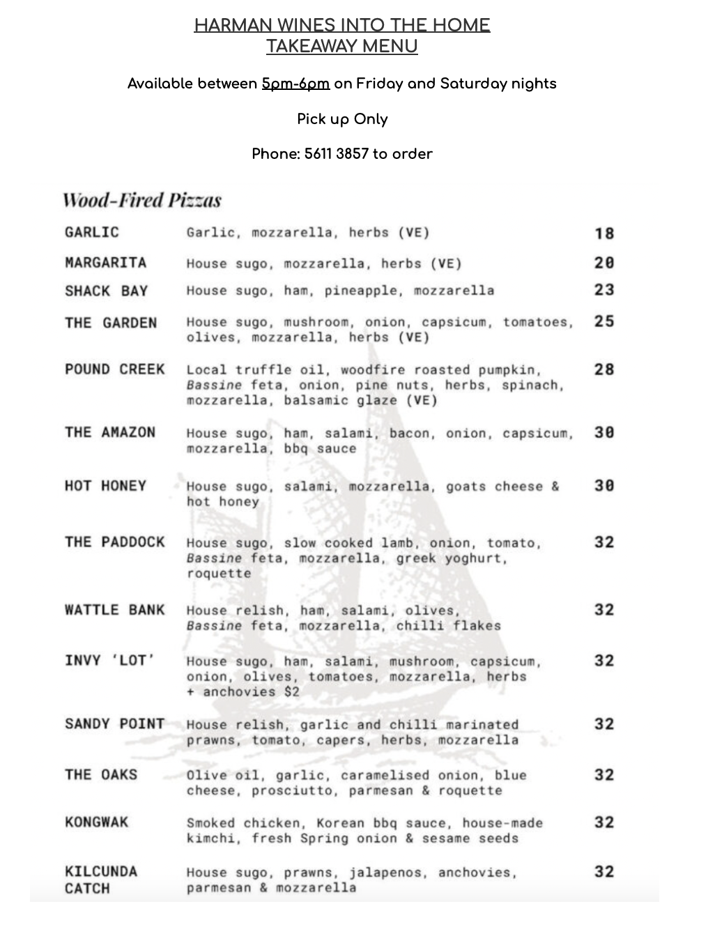 Crafted with fresh, local produce and paired perfectly with our estate-grown wines, our takeaway menu brings the Harman Wines experience into your home